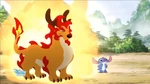 Qi Lin is a four-legged orange creature. He walks on four legs with claws at the end. He has red outgrowths on his back, legs and head, and a yellow-red outgrowth resembling a flame at the end of his tail. His head is decorated with two horns.