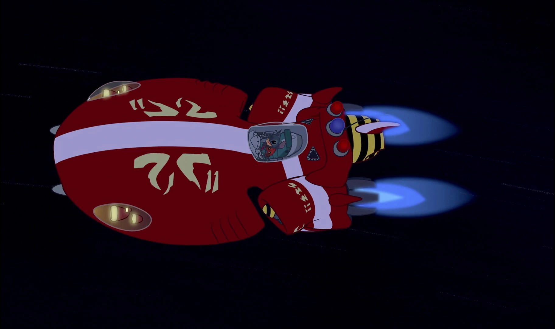After Stitch escapes from his containment room on the Federation Ship and makes his way off the ship through the ventilation system, he hijacks the Red One and is enjoying his flight in it. During his trip, the fleet escorting the federation ship attacked the Red One. Stitch flies back toward them, attempting to shoot them, but ends up losing its gun and has the Red One severely damaged in the process. Despite the severe damage, Stitch is able to activate the Red One's hyperdrive to make a huge jump through space and successfully escapes. However, as the damage the fleet caused to the Red One had disabled its navigation system, he was no longer able to control it throughout space and a few hours later, the Red One came out of hyperspace and crashed on Earth in Kauai, Hawaii. Stitch survived the crash, but the Red One blew up on impact. Lilo and her sister Nani have a brief power outage and see the Red One with a bright green glow around it fall from the sky and crash-land near their house. Lilo assumes it was a meteor and gets very excited to make a wish on it.